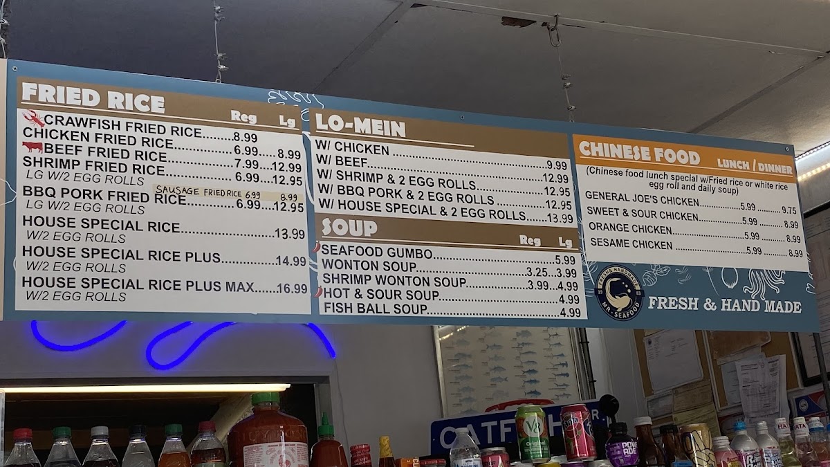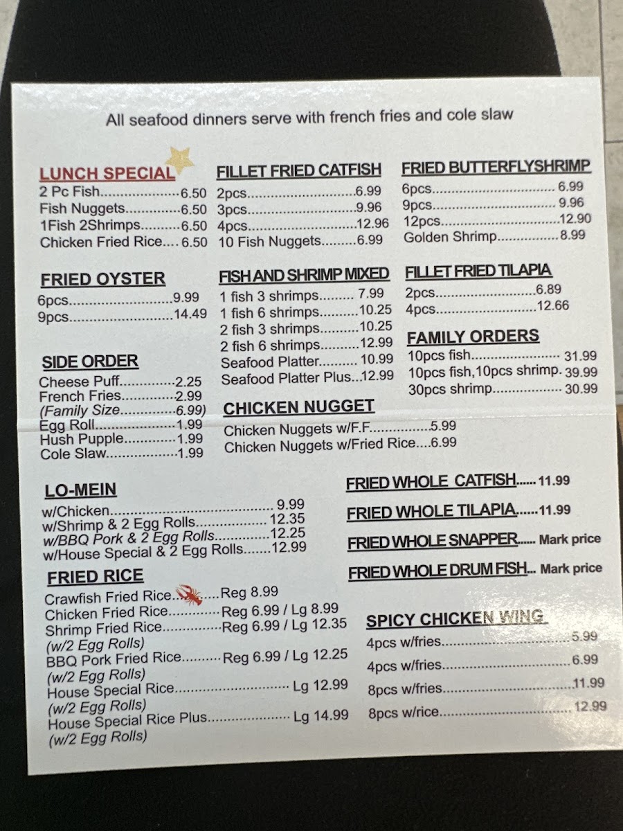 Here, you’ll find a range of fried rice options, from Chicken Fried Rice to the House Special Rice, all cooked with a wok-char that brings a pleasing depth to each bite. Alongside those, seafood staples like crispy fried fish and shrimp share space with flavorful dishes such as Seafood Gumbo and Kung Pao Chicken, reflecting a balance between fresh seafood and comforting Chinese-inspired meals.
